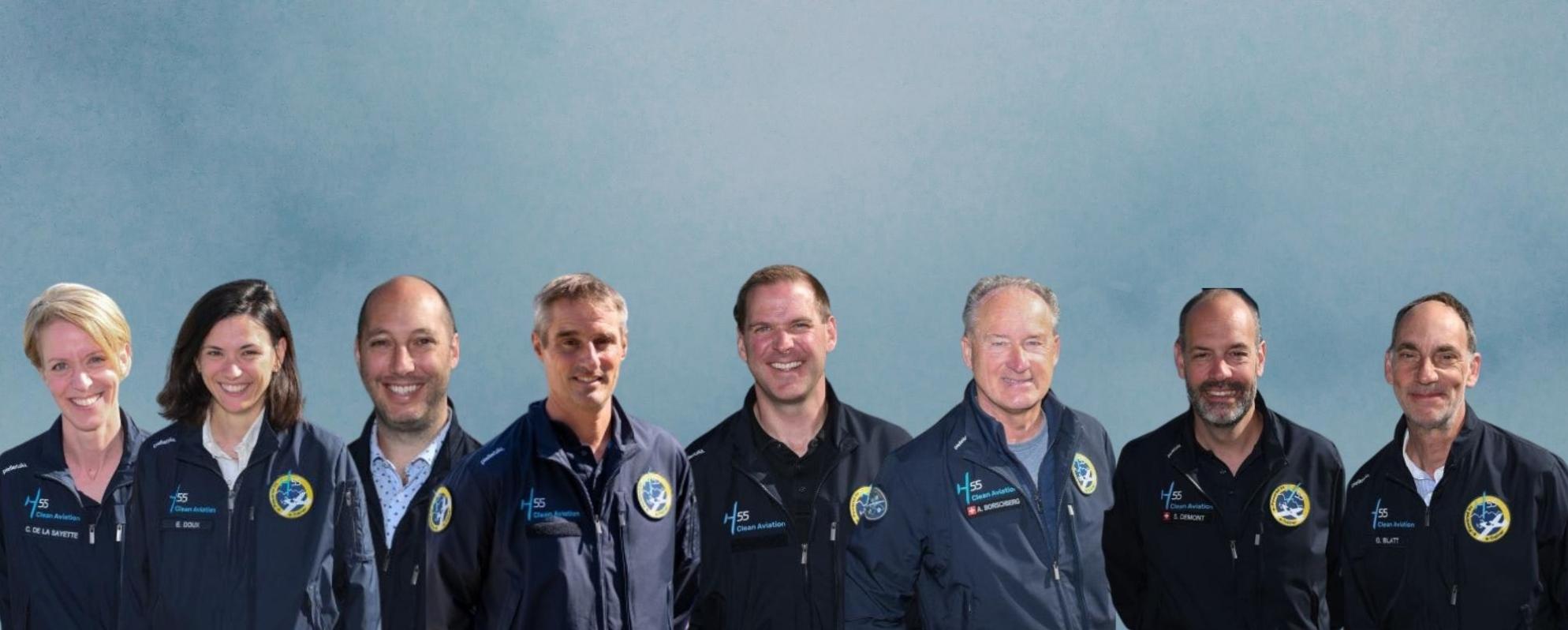 H55 team: Carine De La Sayette (Head of Programs), Emmanuelle Doux (Head of Human Resources), Lawrence Blakeley (COO), Stéphane Fallot (Head of Finance), Martin Larose (CEO), André Borschberg (Co-Founder and Executive Chairman), Sebastien Demont (Co-Founder & CTO), and Gregory Blatt (Co-Founder & Chief Sales Marketing Officer)