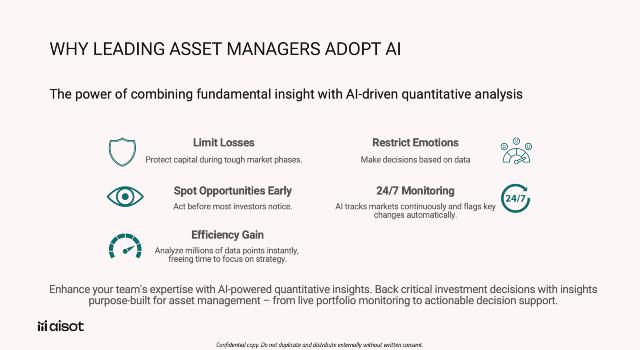 Institutions (family offices, asset managers, banks) typically use Aisot as: 1) an additional alpha signal source, 2) an independent risk validation engine, 3) a portfolio construction layer or 4) a research accelerator for internal teams.