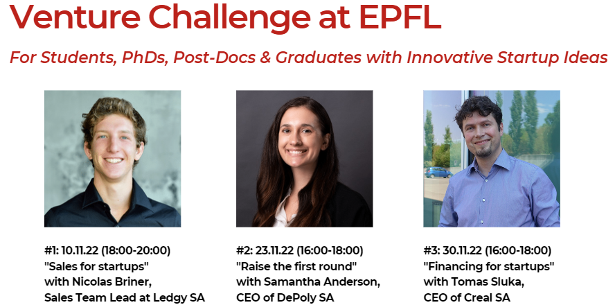 Venture Challenge is a workshop series where you can meet successful entrepreneurs and hear about their experience and recommandations on a specific entrepreneurial topic.